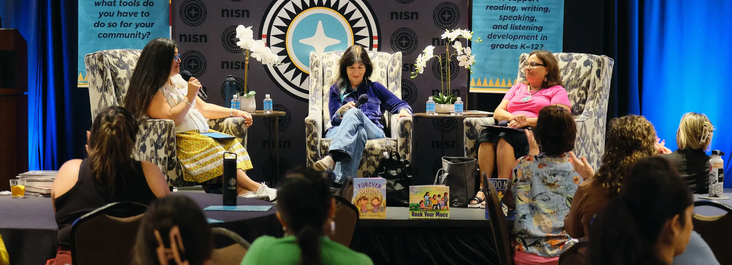 Laurel at the 2024 Native Literature Symposium; Panelist with Joy Harjo (center) and moderator, Tara Gatewood (left). Photo courtesy of NISN.